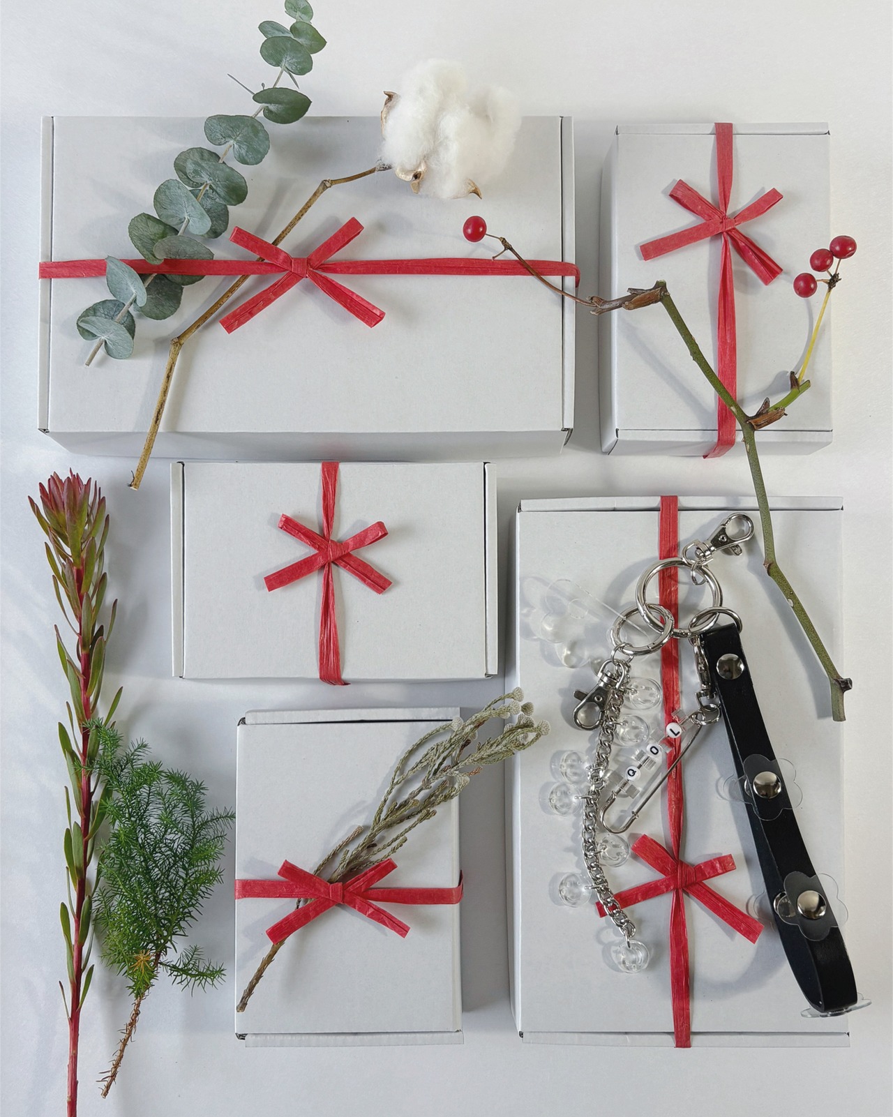 →1つ穴と2つの穴のナイロン製タグはアレンジを広げるオリジナルアイテムです。