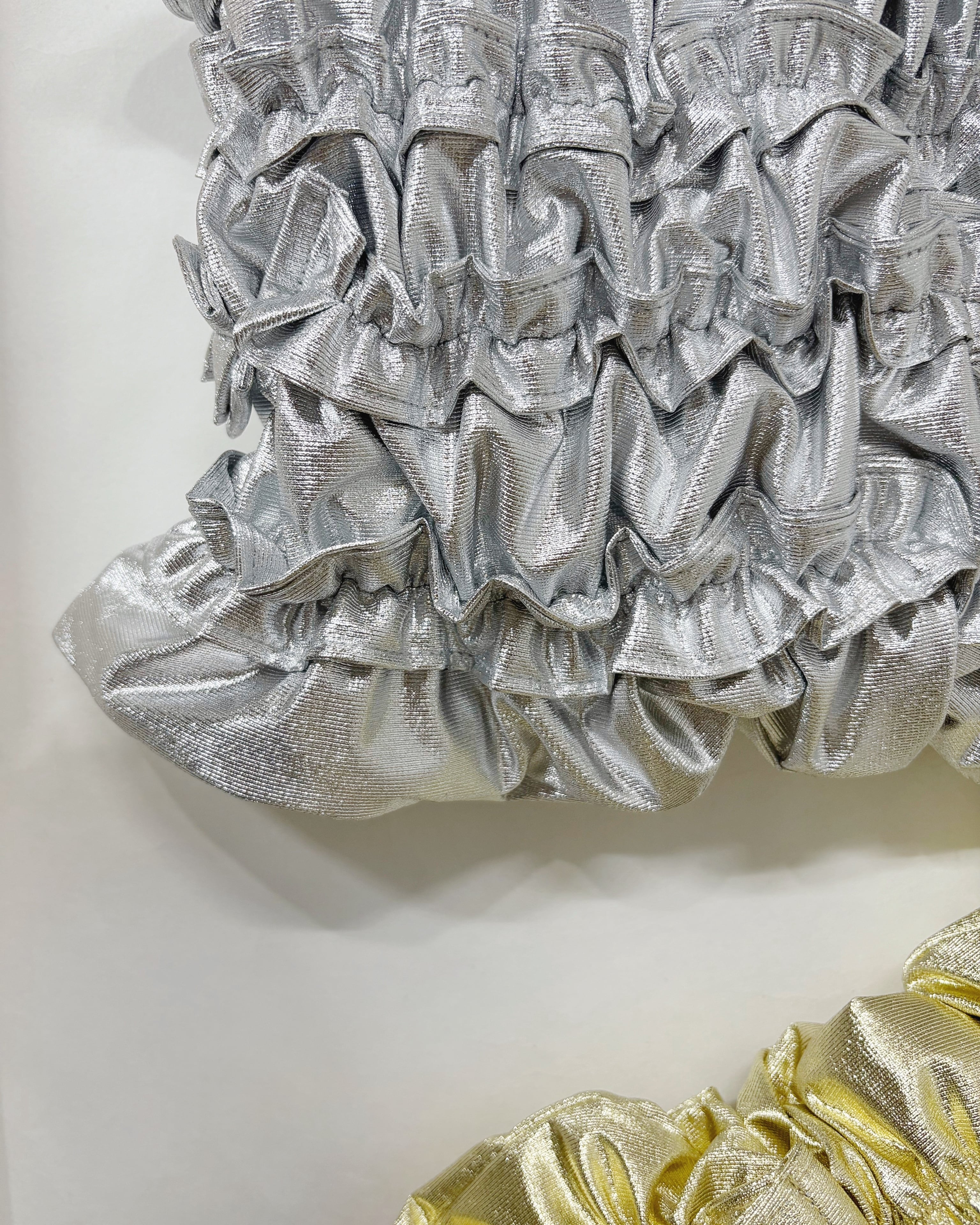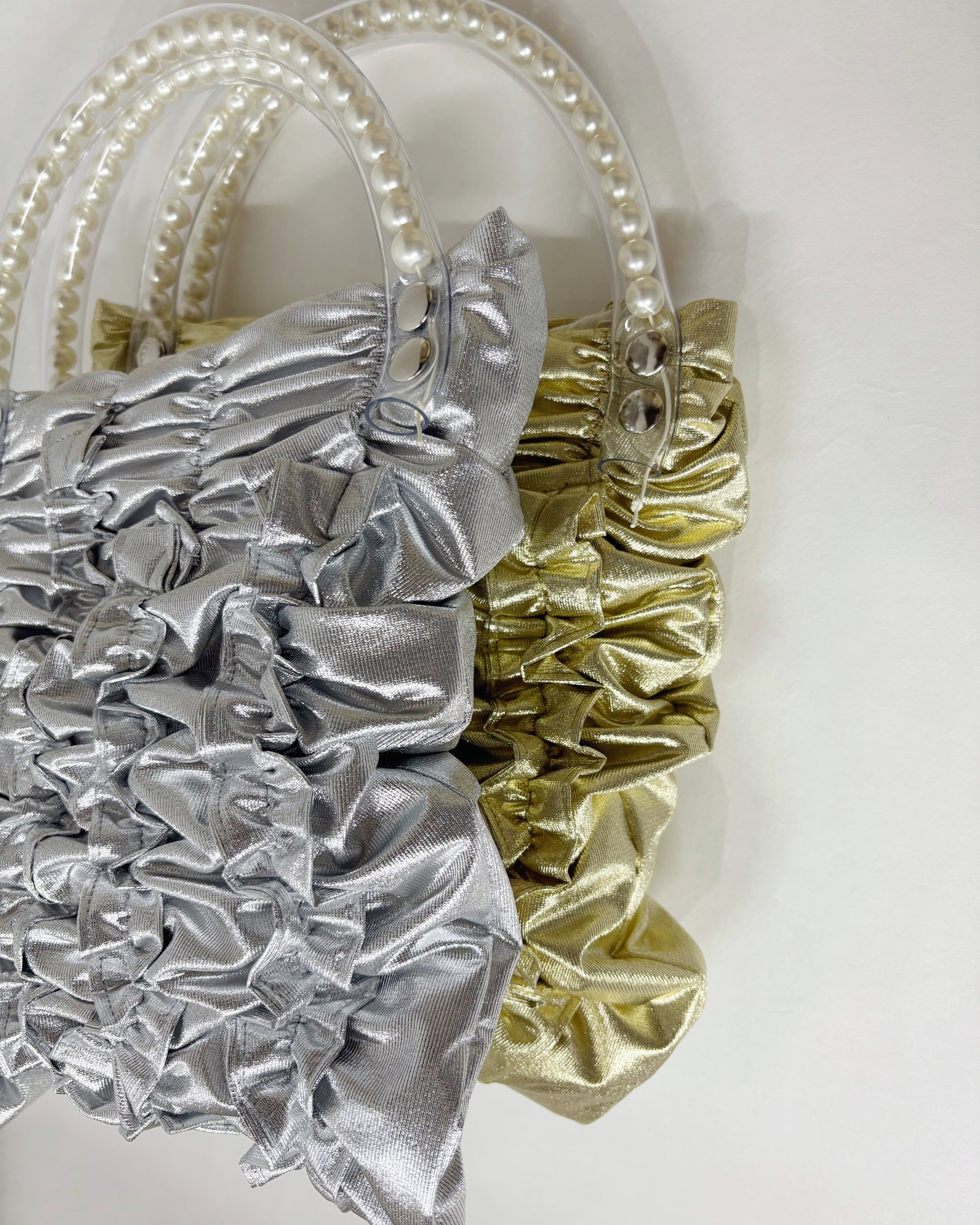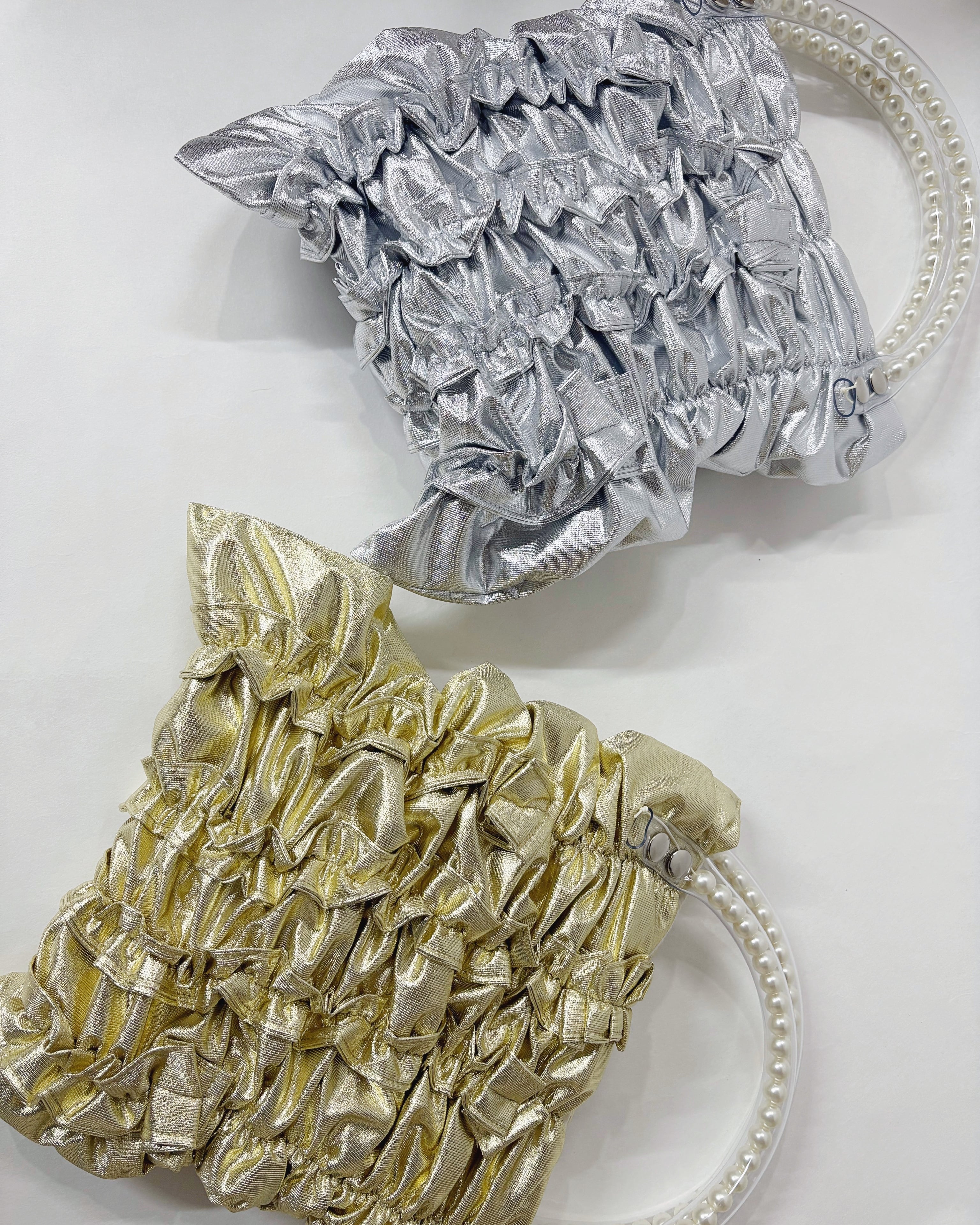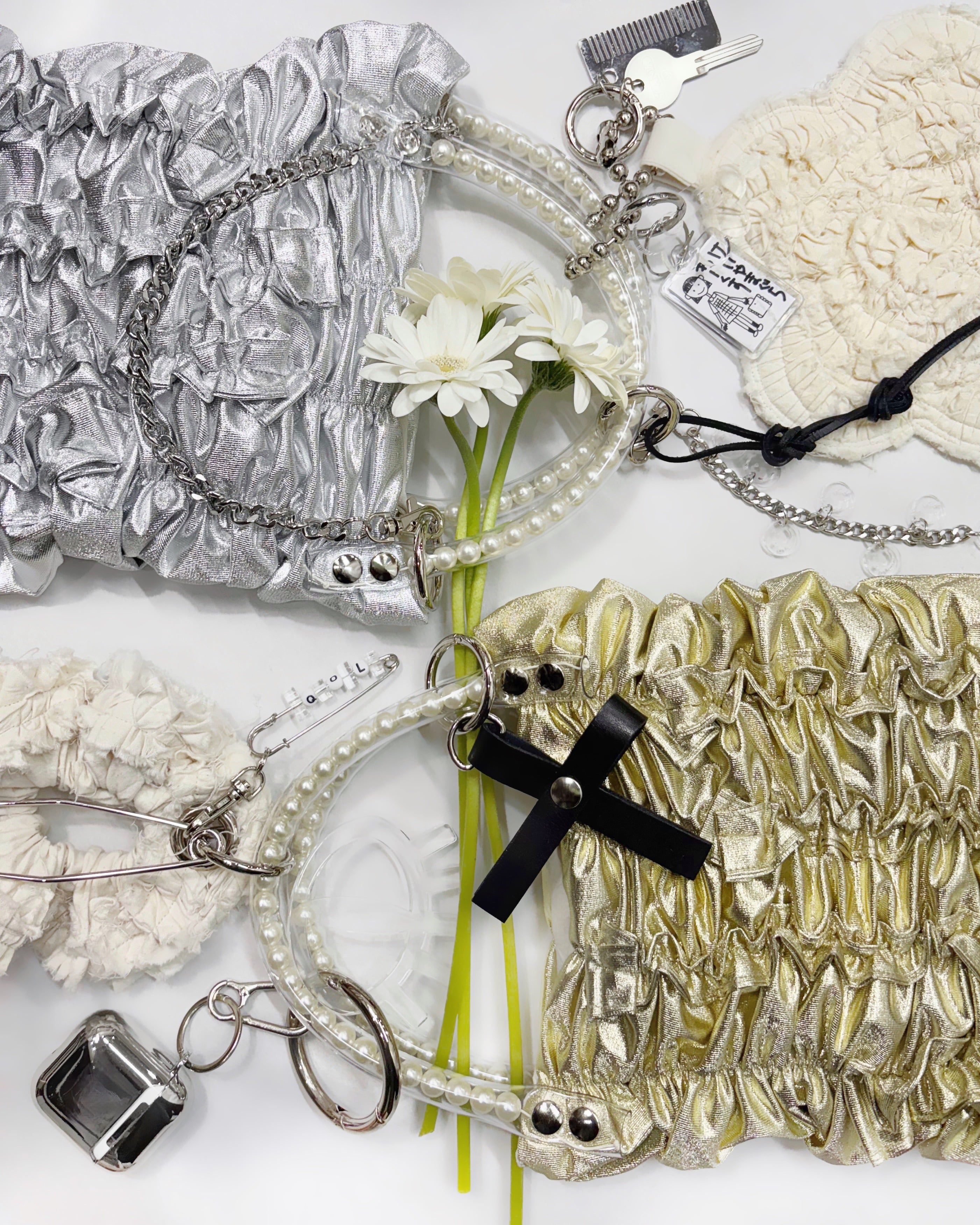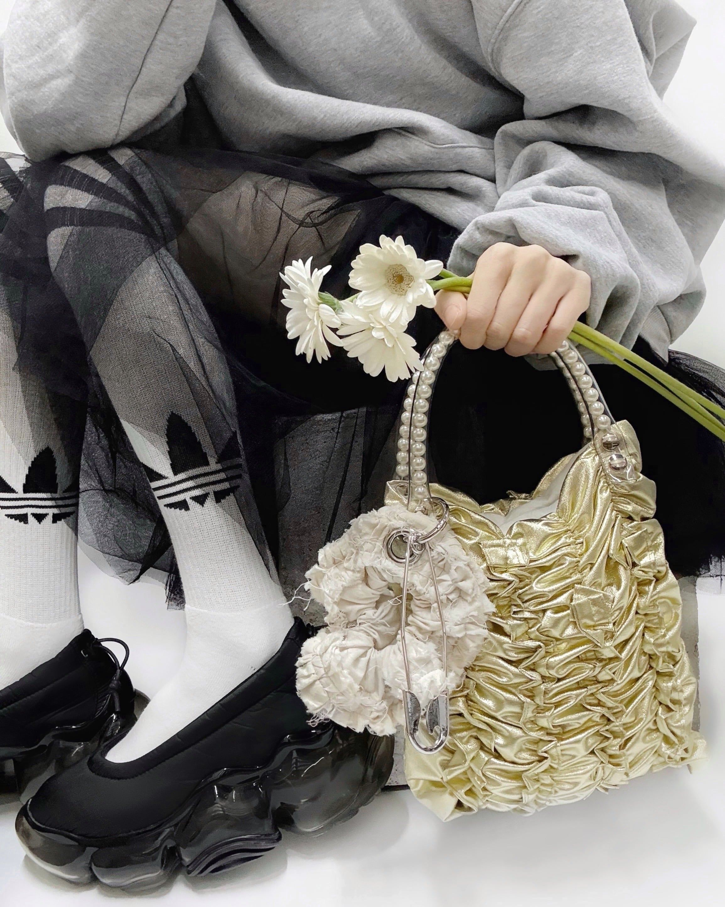 コラージュシリーズアイテムはゴムを縫い付けてギャザーを生み出しています。